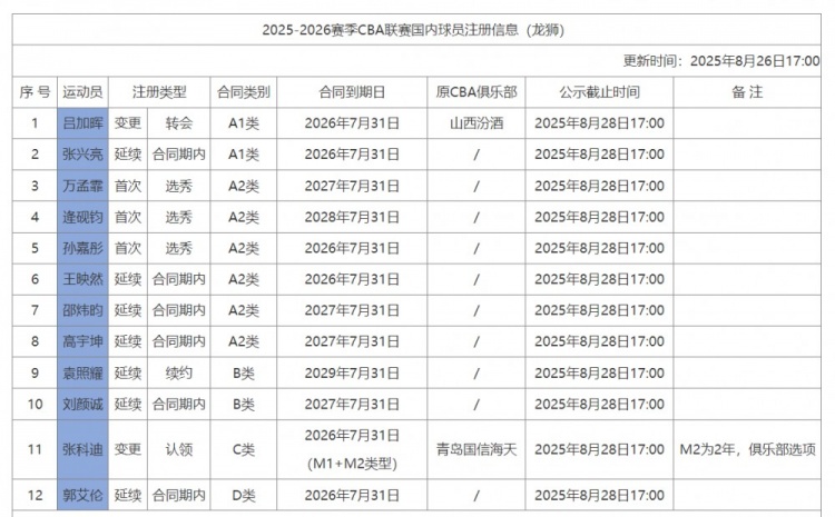 其中,郭艾伦的D类合同明年夏天到期,球队与袁照耀以B类合同续约2年,陷入交易传闻的焦泊乔暂未注册。